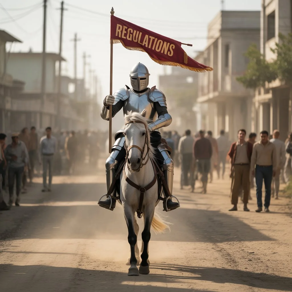 Ideogram’s interpretation of the prompt “a white knight of regulation riding too slowly to actually help anyone.” I’m not sure why he’s in a spaghetti western, or why it’s set in India. (Source: Ideogram)