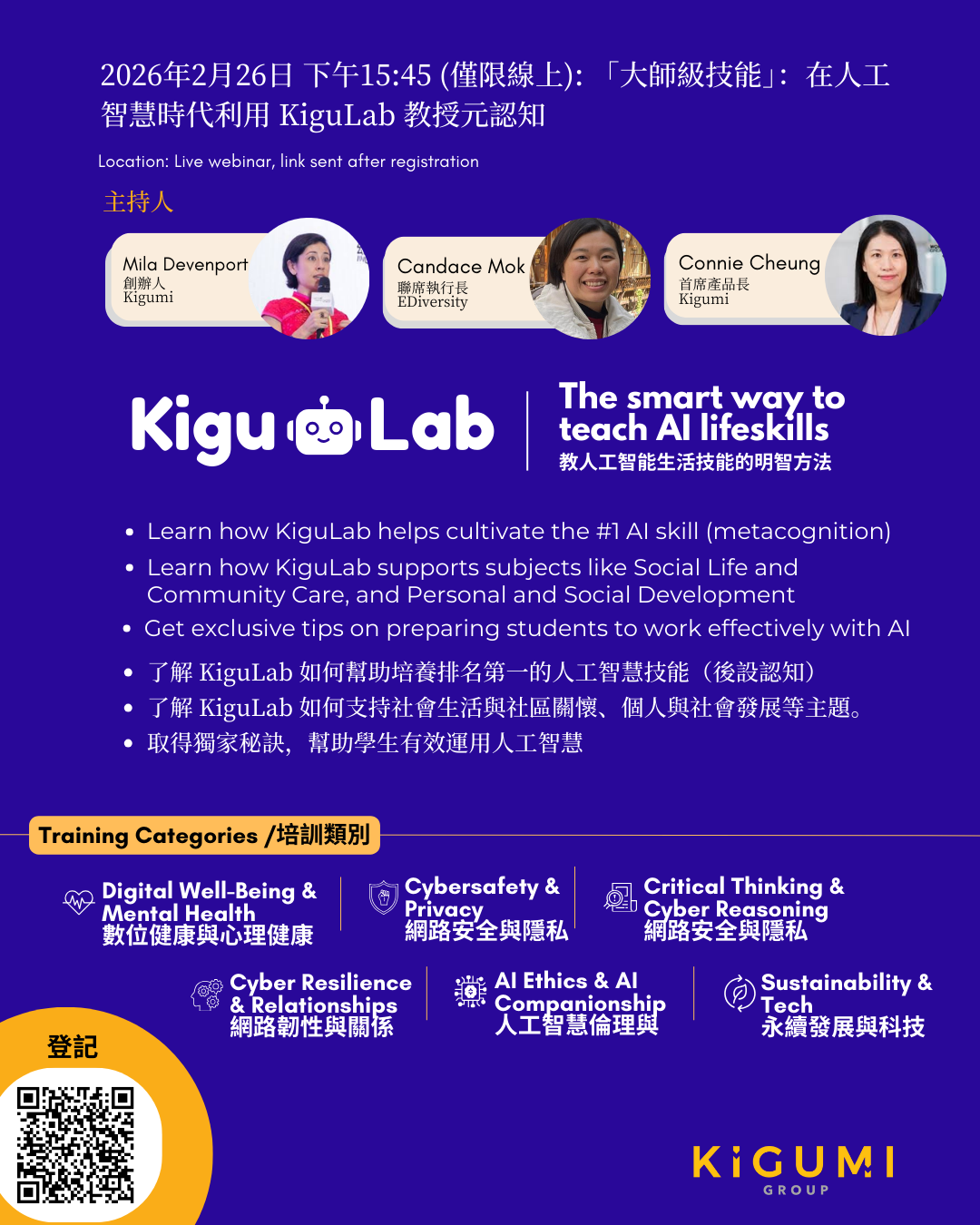 因為我們從使用 KiguLab 的學校那裡了解到,它不僅有效地教授了數位健康知識,還幫助學校了解有問題的數位行為(例如問題遊戲),我們的平台和課程設計也幫助學生就敏感的數位健康話題展開建設性、開放的對話。