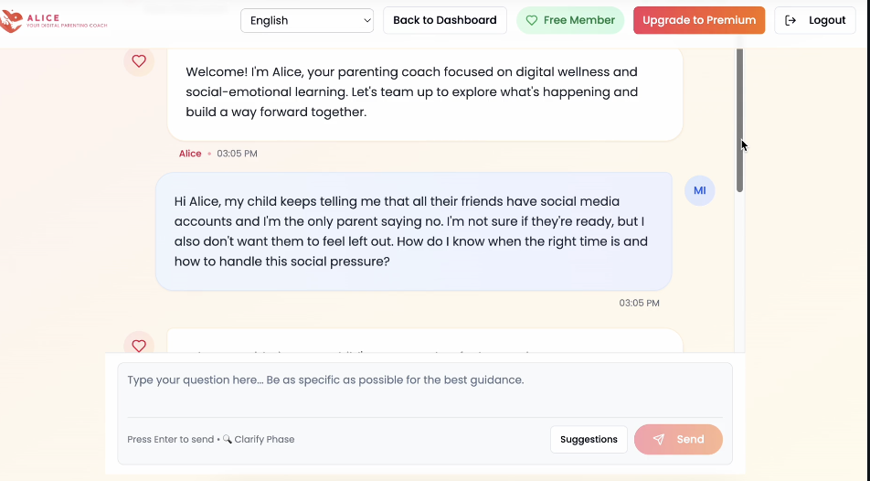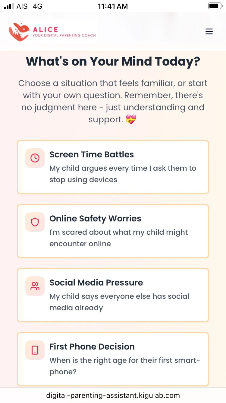 1 year-access to Alice, our AI Digital Parenting Coach. A safe place for parents to securely ask all their sensitive questions and receive practical, personalized advice on family digital wellbeing.